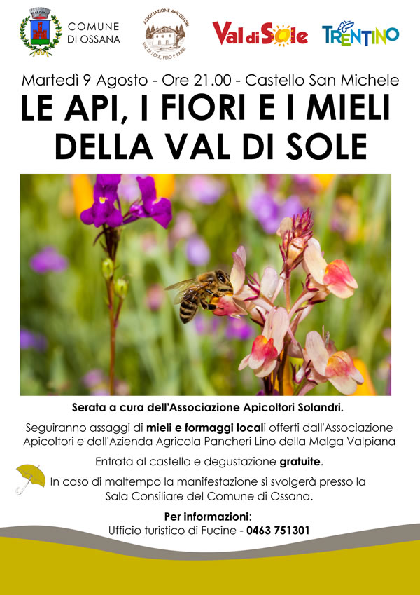L'Associazione apicoltori della Val di Sole organizza martedì 9 agosto alle ore 21 a Ossana una serata sulle api ed il miele. Seguiranno assaggi di mieli e formaggi locali. Entrata al castello e degustazione gratuite. In allegato la locandina.
